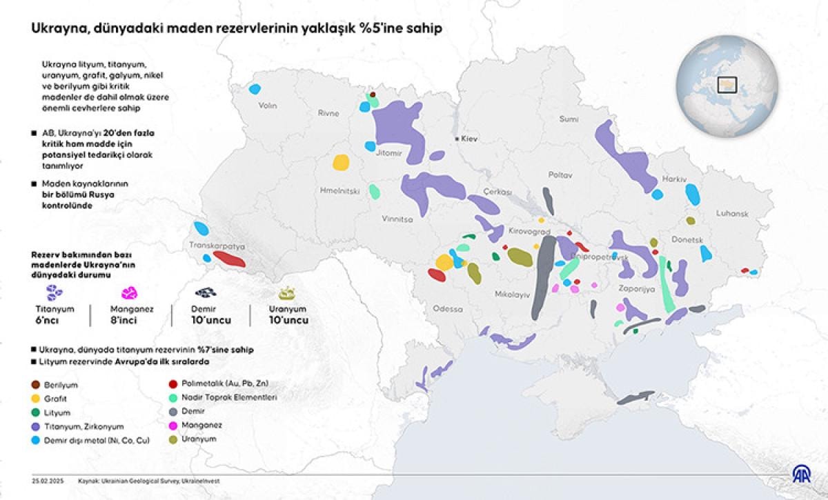 Ukrayna, yaygın olarak kullanılan kritik madenlerin büyük çoğunluğuna sahip olsa da kömür yatakları başta olmak üzere bunların bir kısmı 2014’te Rusya'nın Kırım'ı yasa dışı ilhakı ve 2022’de başlayan savaş sonrasında ya Moskova'nın kontrolüne geçti ya da cepheye yakın konumlarda yer alıyor.