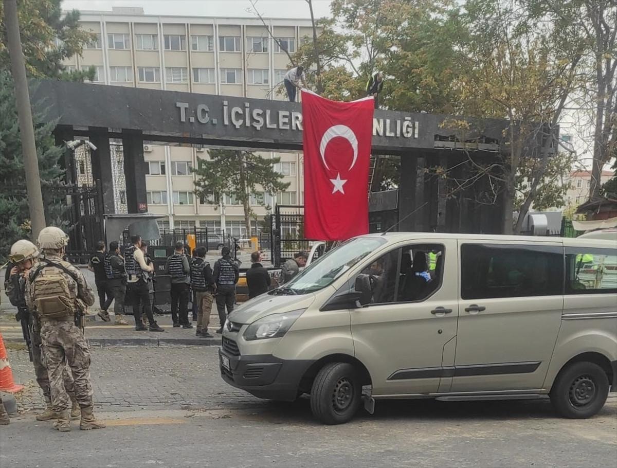 Terör saldırısı sonrası İçişleri Bakanlığı Emniyet Genel Müdürlüğü giriş kapısı önüne Türk bayrağı asıldı.