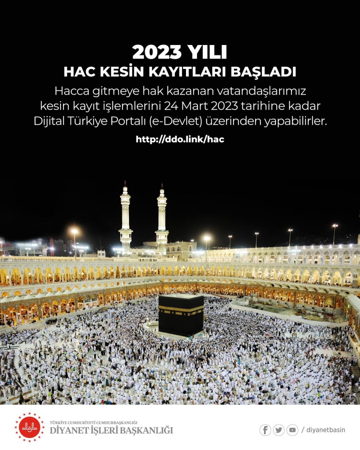 Açıklamada, "2023 yılı hac kesin kayıtları başladı. Hacca gitmeye hak kazanan vatandaşlarımız kesin kayıt işlemlerini 24 Mart 2023 tarihine kadar Türkiye Portalı (e-Devlet) üzerinden yapabilirler." denildi.