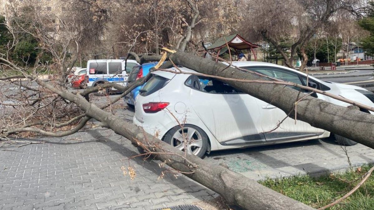 Etlik Zübeyde Hanım Kadın Hastalıkları Eğitim ve Araştırma Hastanesi'nin bahçesinde park halindeki iki aracın üzerine rüzgarın etkisiyle ağaç devrildi.
