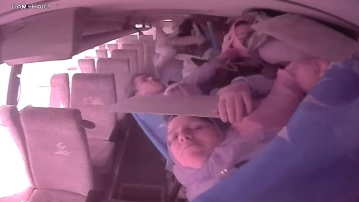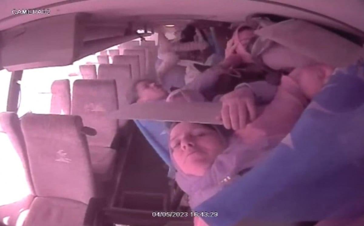 Görüntülerde; 3 çocuklu bir kadının araca binmesinden 1 dakika sonra eğimli yolda midibüsün aniden hızlandığı, sürücünün manevra yapıp aracı durdurmaya çalıştığı, kontrolden çıkan aracın duvara çarparak devrildiği, oturdukları koltuklardan savrulan yolcuların büyük korku ve panik yaşadığı anlar yer aldı.