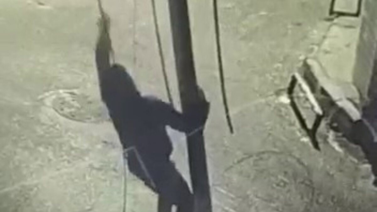 Kabloyu tutan hırsız arkadaşının üzerinden zıplayarak kabloyu koparttı. O anlar ise güvenlik kameralarınca anbean kaydedildi.