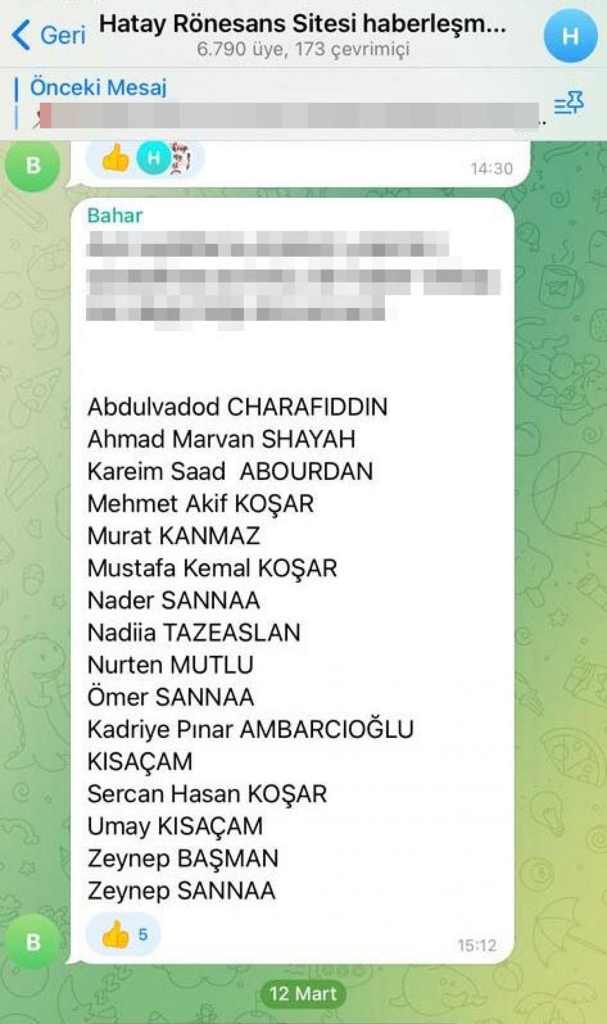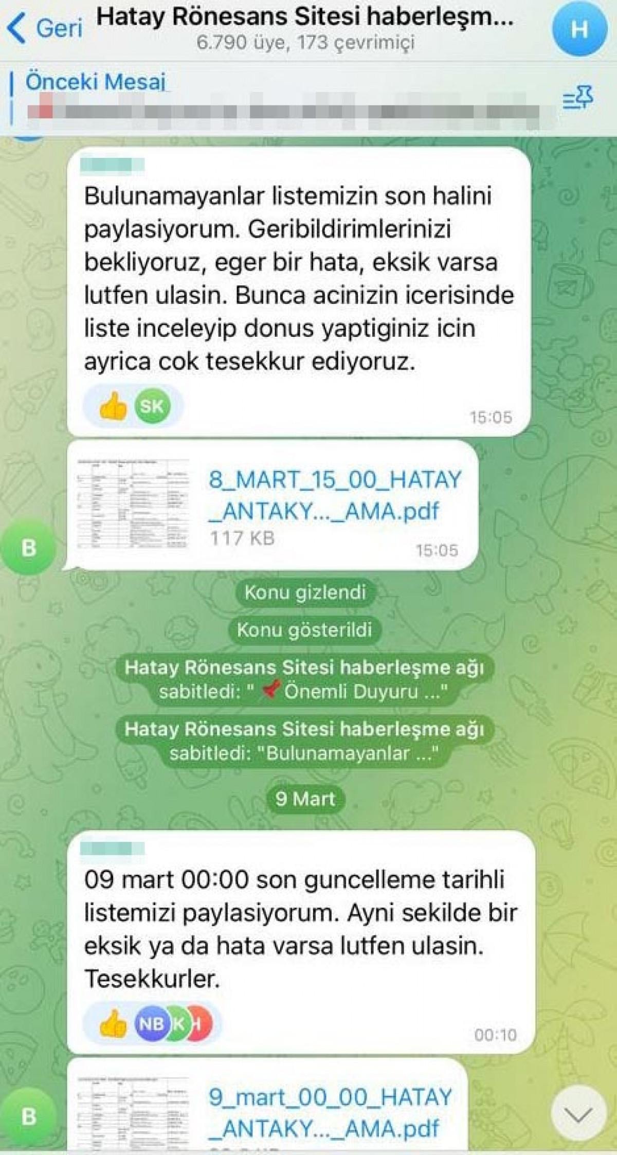 Arkadaşımızın ailesi Rönesans Rezidans enkazında kalmıştı. Biz de yurt dışında yaşıyoruz. Depremle ilgili haberi öğrenir öğrenmez bilgi almaya çalıştık. Yıkıntıları gördükten sonra grubu kurduk. Arkadaşlarımızın yakınlarını bulmak için kurduğumuz grup, eksik listelerinin paylaşıldığı bir gruba döndü. Son olarak geldiğimiz noktada ise kayıp vatandaşlarımızı arıyoruz. Sayımız bir anda arttı. İlk günlerde herkes kayıpların isimlerini yazıyordu.