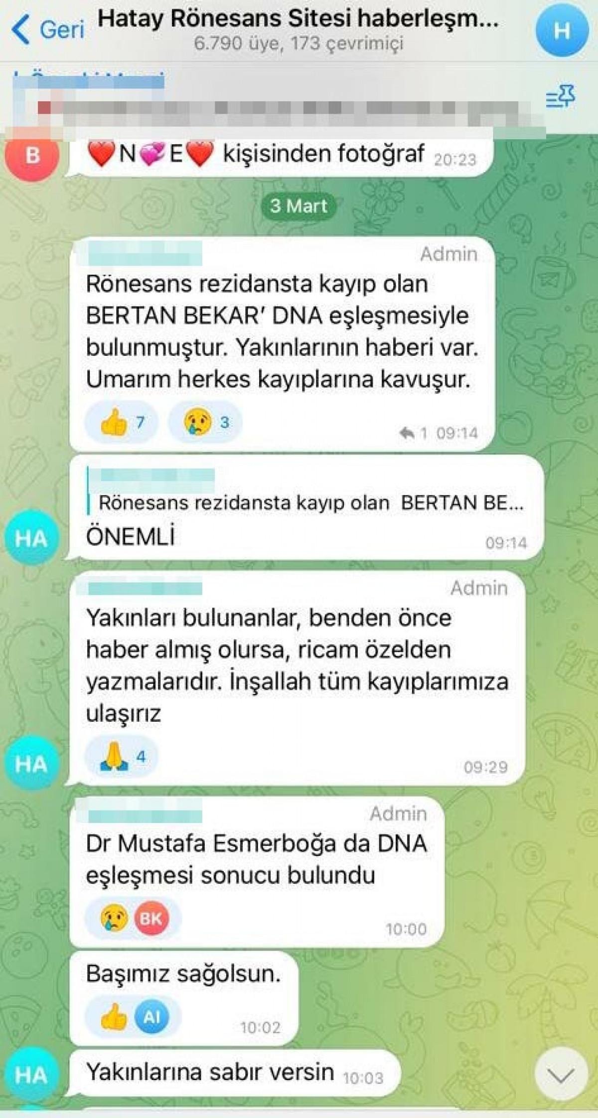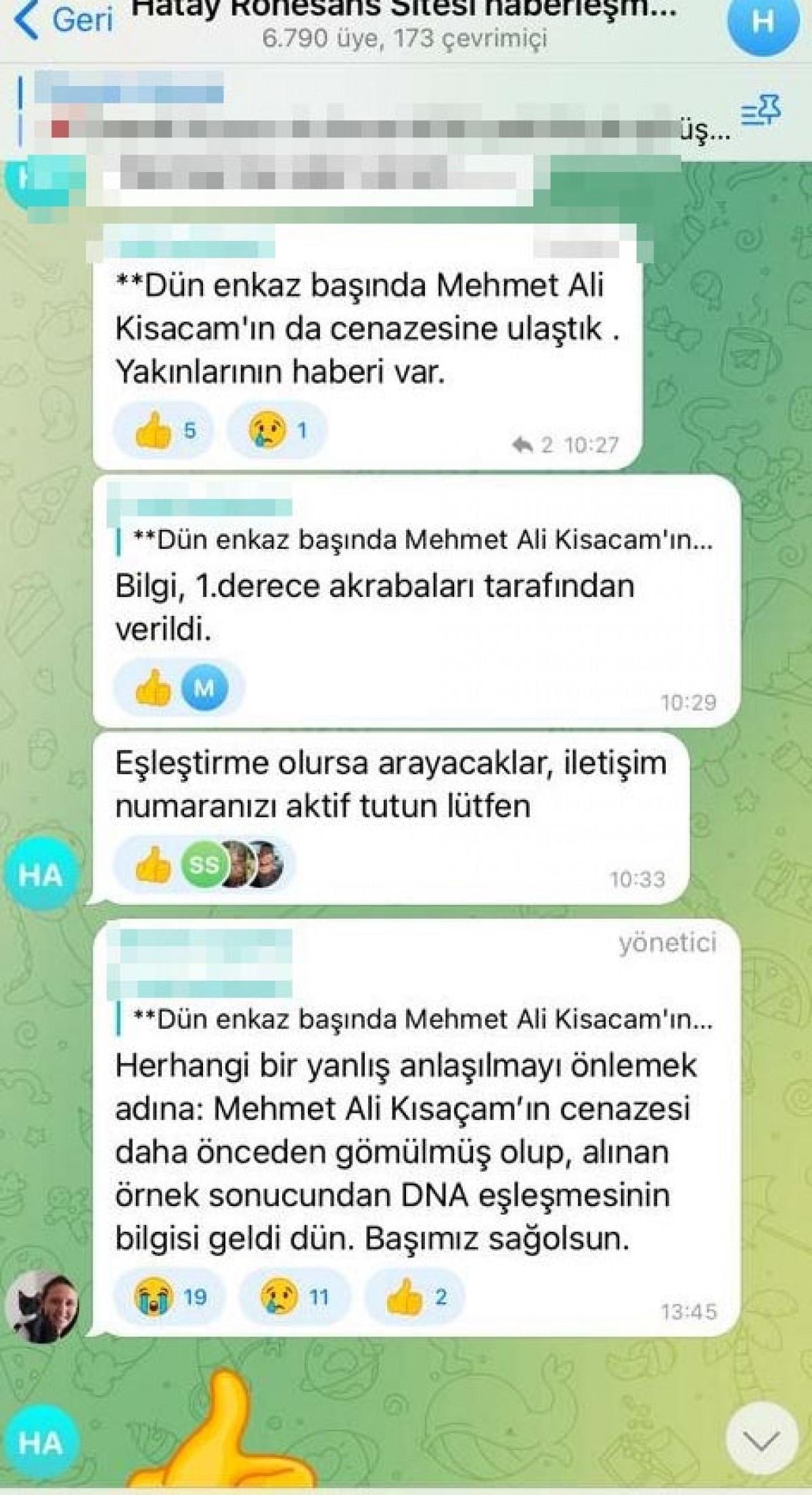 Bazı kişiler yakınlarına bazıları da yakınlarının cenazelerine ulaştı. Oluşturduğumuz listeye göre şu anda 63 kayıp var. Bilgileri birkaç kez teyit etmeden hiçbir grupta paylaşmıyoruz. Grubumuza katkıda bulunan, sahadan bilgi aktaran, canla başla çalışan grup yöneticilerimiz basta olmak üzere destek sunan herkese çok teşekkür ediyoruz.