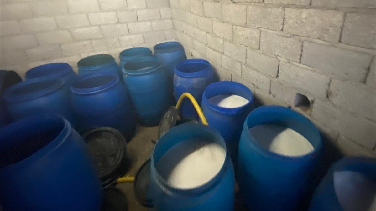 Adreste, plastik variller içerisinde 6 bin litre sahte içki bulundu.