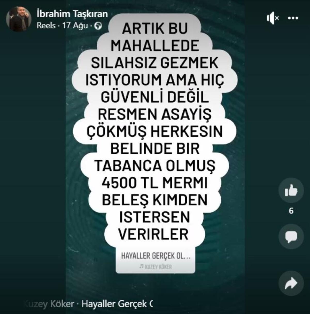 Sosyal medya hesabından "Artık bu mahallede silahsız gezmek istiyorum ama hiç güvenli değil. Resmen asayiş çökmüş. Herkesin belinde bir tabanca olmuş 4 bin 500 TL. Mermi bedava.Kimden istesen verirler" paylaşımı yapan İbrahim Taşkıran, 1 Eylül'de aynı caddede uğradığı silahlı saldırıda hayatını kaybetmişti.