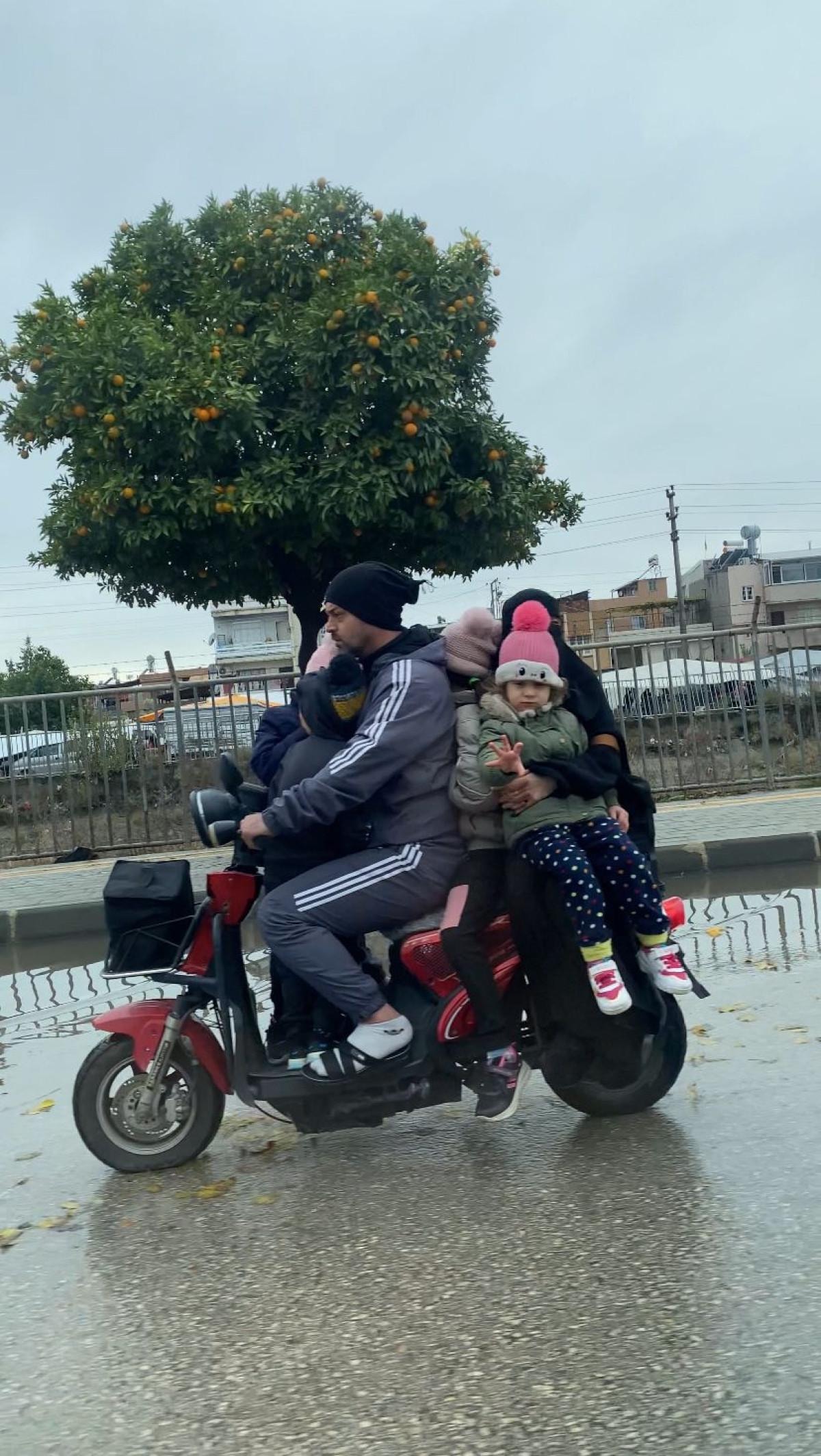 Adana'nın Yüreğir ilçesi Ege Bagatur Bulvarı'nda 2 kişilik motosiklette anne, baba ve 4 çocukları yolculuk yaptı.
