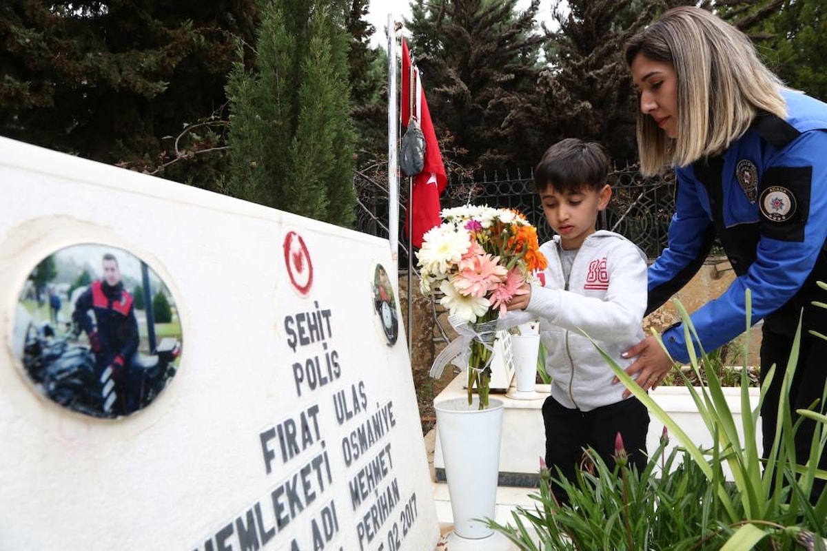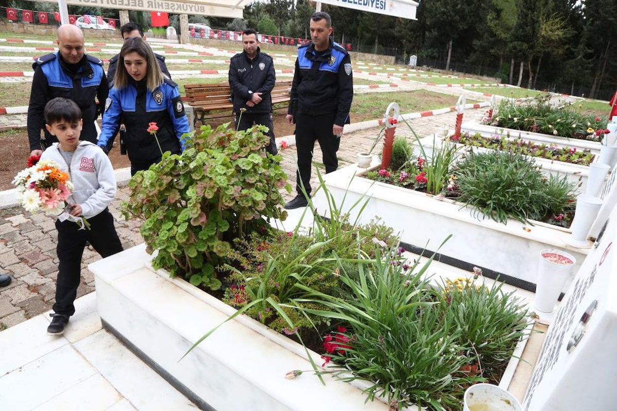 Toplum Destekli Polislik Şube Müdürlüğüne görevli polisler, Efe’yi evinden polis aracı ile alarak babasının bulunduğu Kabasakal Mezarlığı'ndaki şehitliğe götürdü.