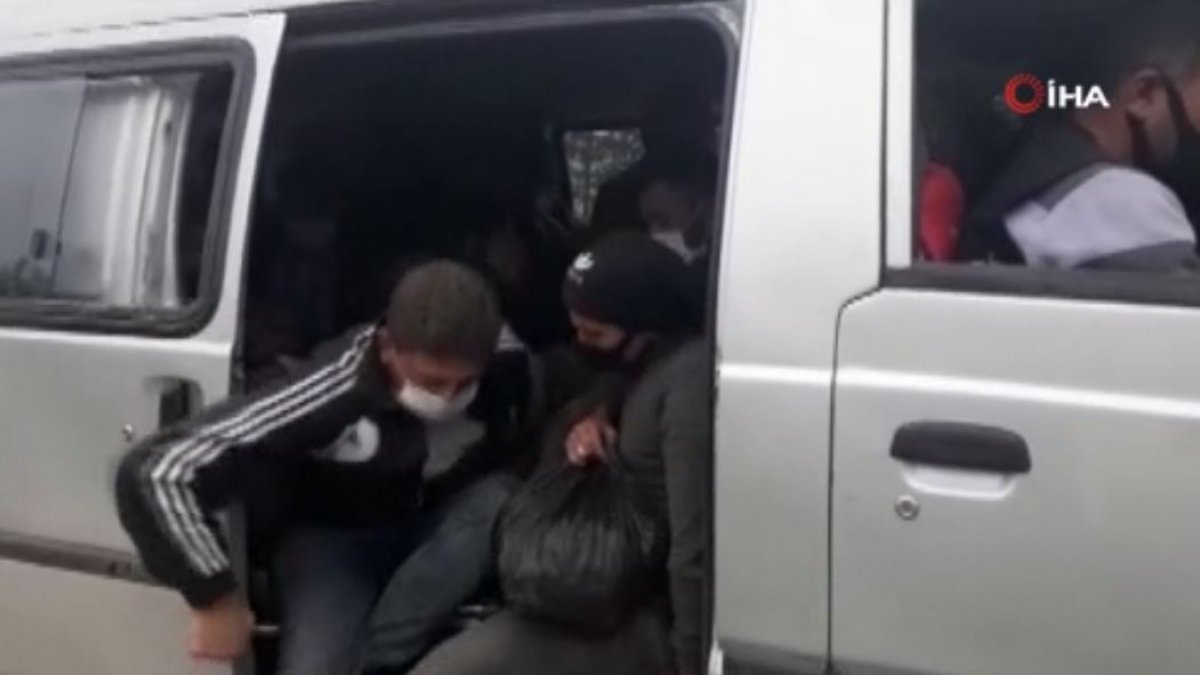 Aracın ön kısmında şoförle birlikte 3 kişi olduğu görülürken, arka bölümdeki koltukların sökülerek 3’ü kadın olan 15 kişinin oturduğu görüldü.