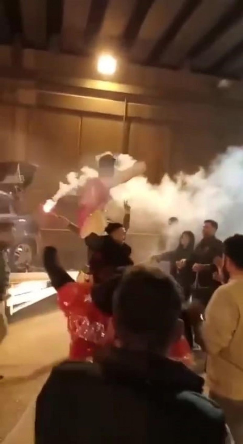 Yakınları askere gidecek bir grup, toplandıkları yolu trafiğe kapatarak birbirlerinin omzuna çıktı. Tehlikeyi görmezden gelen grup ellerinde meşaleyle halay çekti.