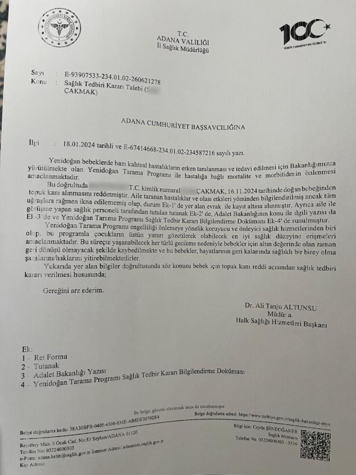 Topuk kanı aldırmayan aile hakkında Sağlık Bakanlığı şikayetçi oldu ve Adana 6. Sulh Hukuk Mahkemesi'nde dava açıldı.
