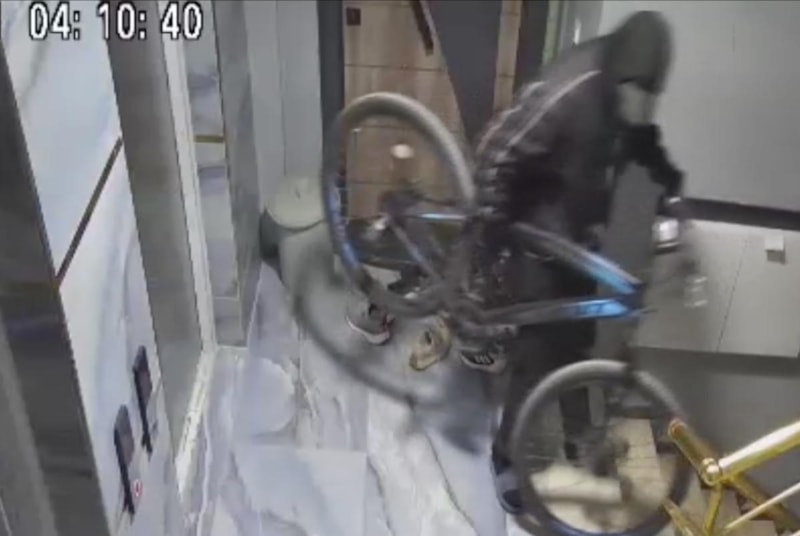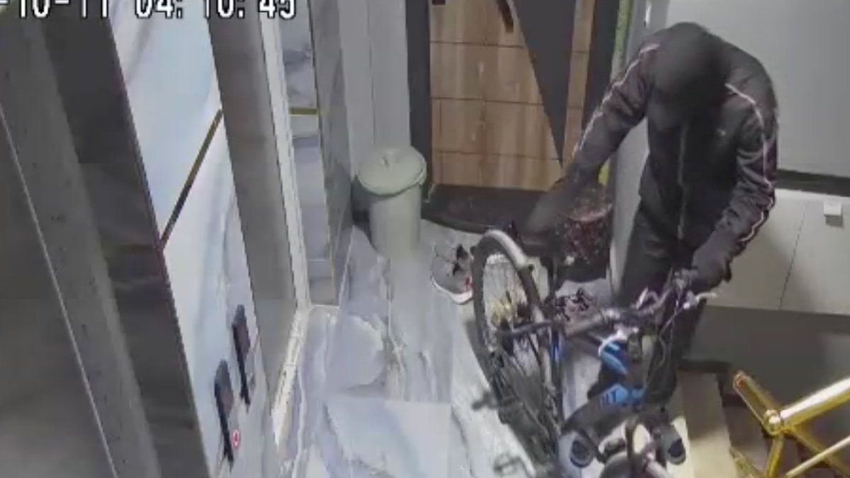 Seyhan ilçesinde yüzü maskeli bir kişinin girdiği apartmandan bisiklet çalıp asansörle kaçırdığı anlar güvenlik kamerasına yansıdı.