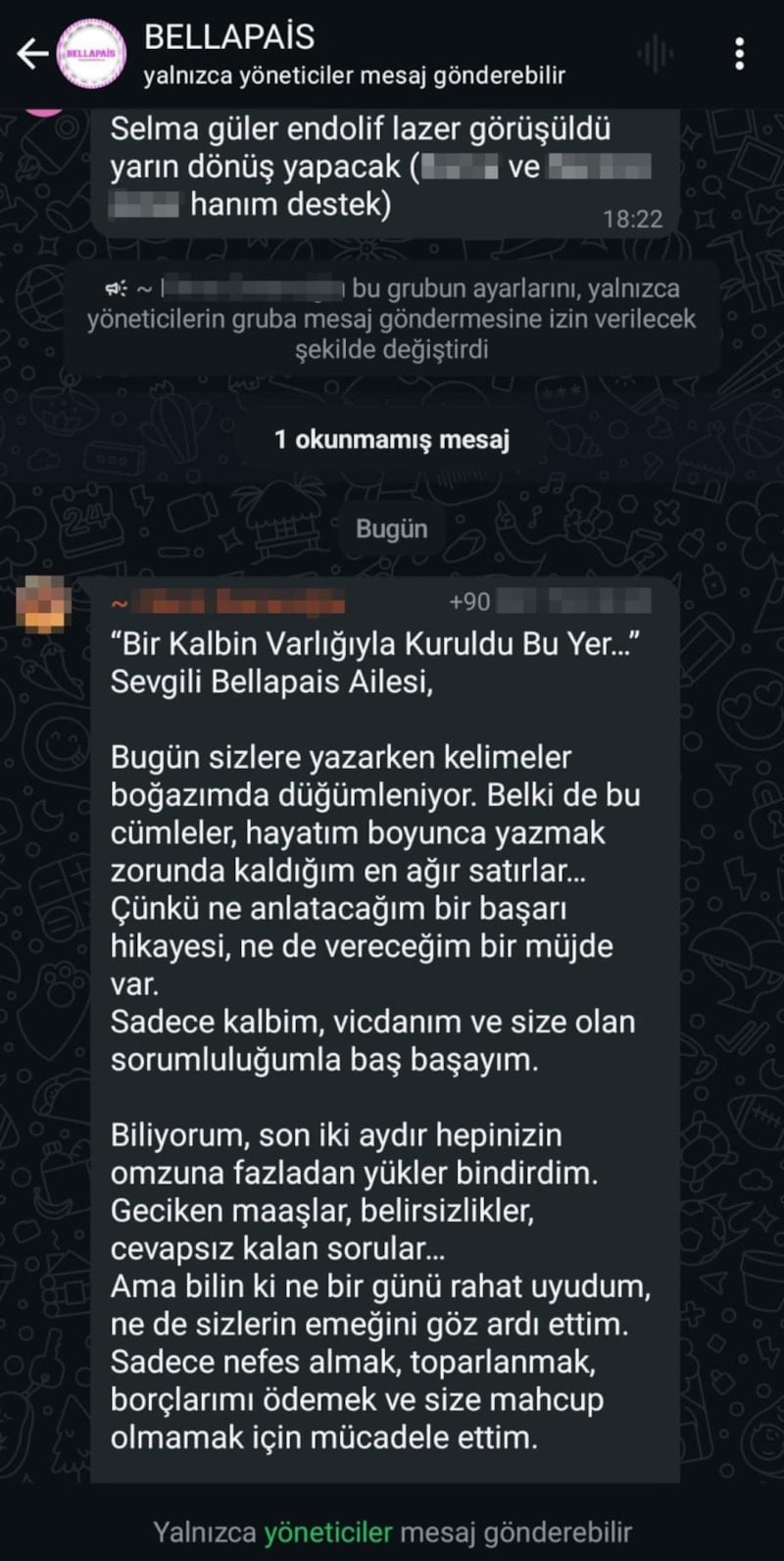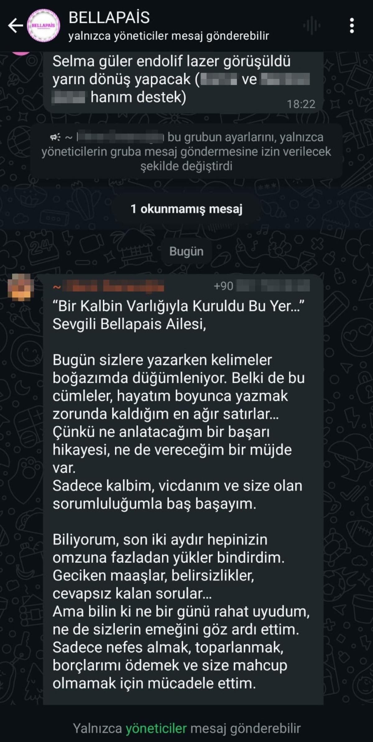 Adı dolandırıcılık olaylarına karışan Bellapais Güzellik Merkezi’nin sahibi Sinem Çekinmez, çalışanlarının olduğu gruba mesaj attı.