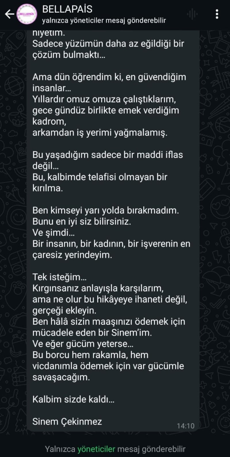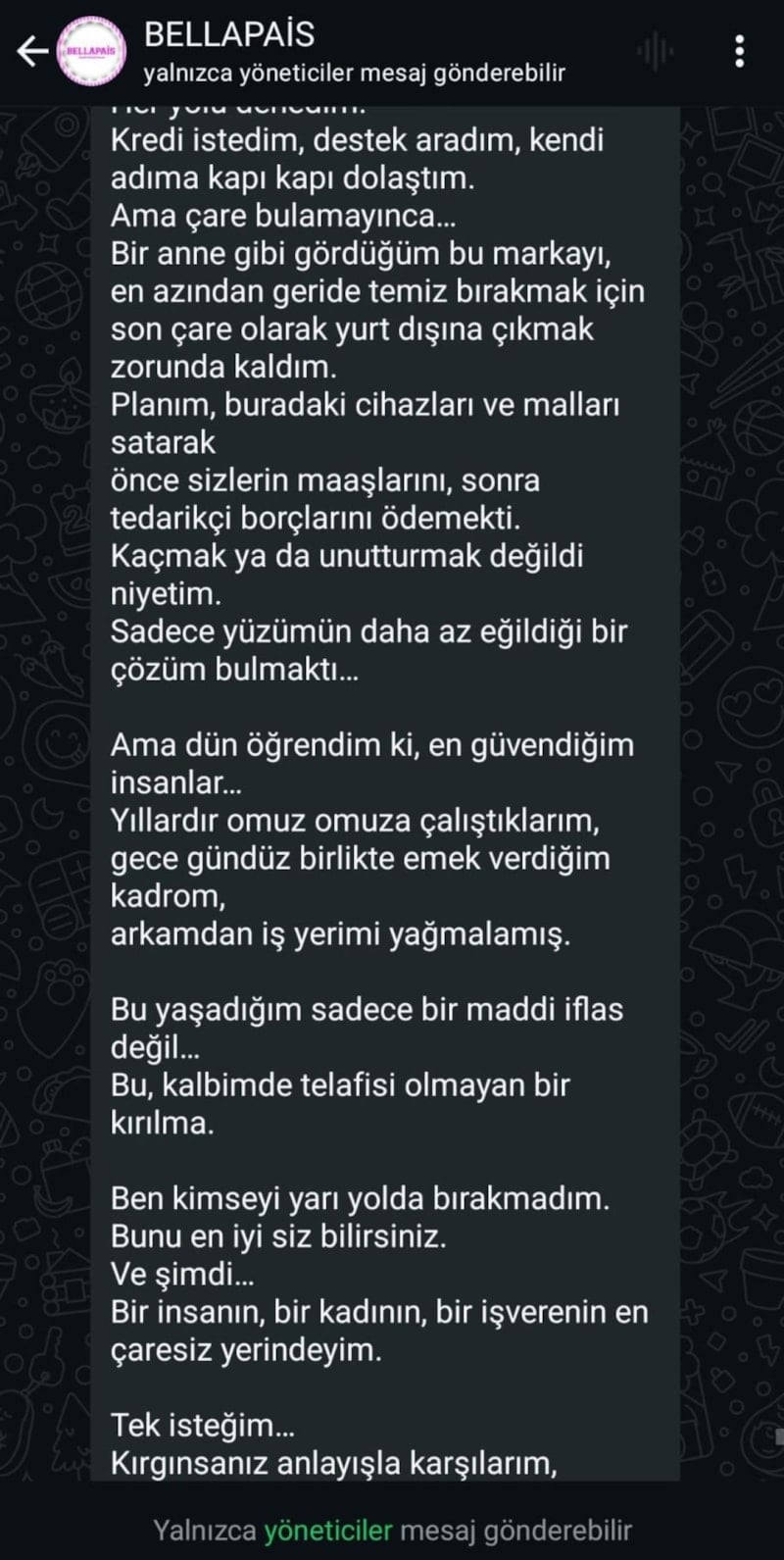 Biliyorum, son iki aydır hepinizin omzuna fazladan yükler bindirdim. Geciken maaşlar, belirsizlikler, cevapsız kalan sorular. Ama bilin ki ne bir günü rahat uyudum, ne de sizlerin emeğini göz ardı ettim. Sadece nefes almak, toparlanmak, borçlarımı ödemek ve size mahcup olmamak için mücadele ettim. Her yolu denedim. Kredi istedim, destek aradım, kendi adıma kapı kapı dolaştım. Ama çare bulamayınca. Bir anne gibi gördüğüm bu markayı, en azından geride temiz bırakmak için son çare olarak yurt dışına çıkmak zorunda kaldım.