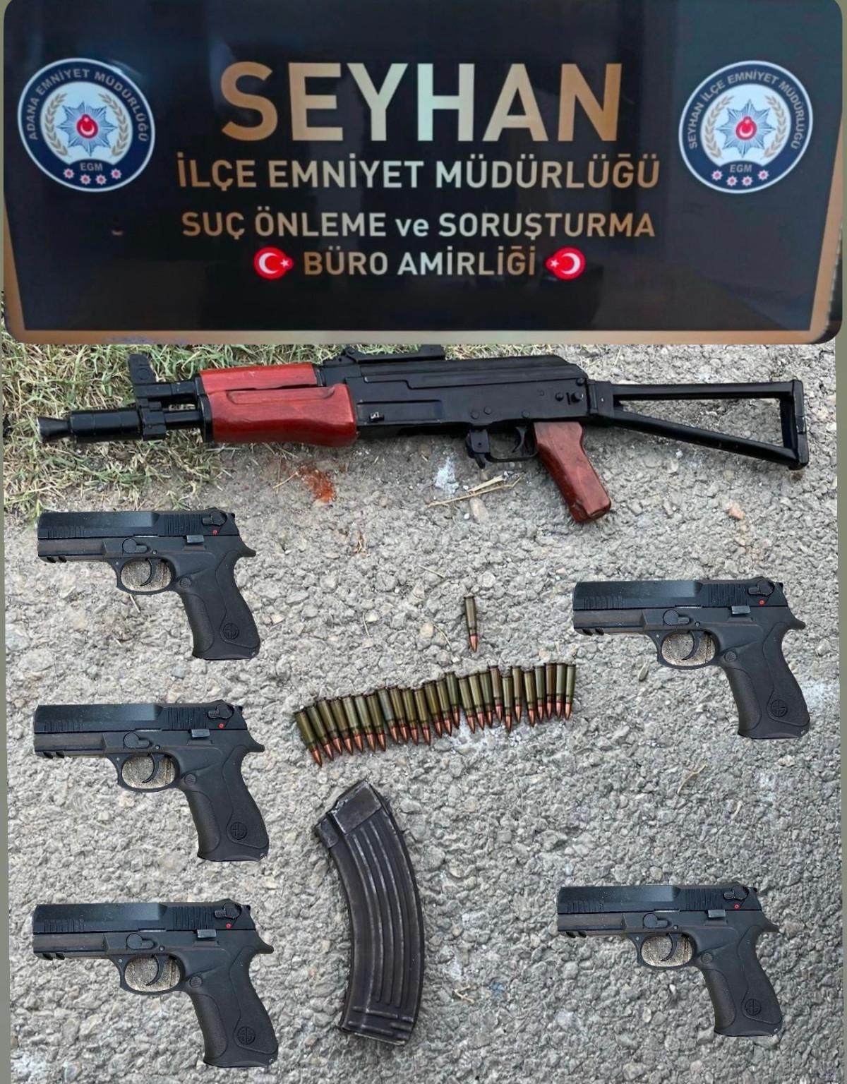 Polis araçta yaptığı aramada, ruhsatsız 5 tabanca ve bir kalaşnikof piyade tüfeği ele geçirdi.