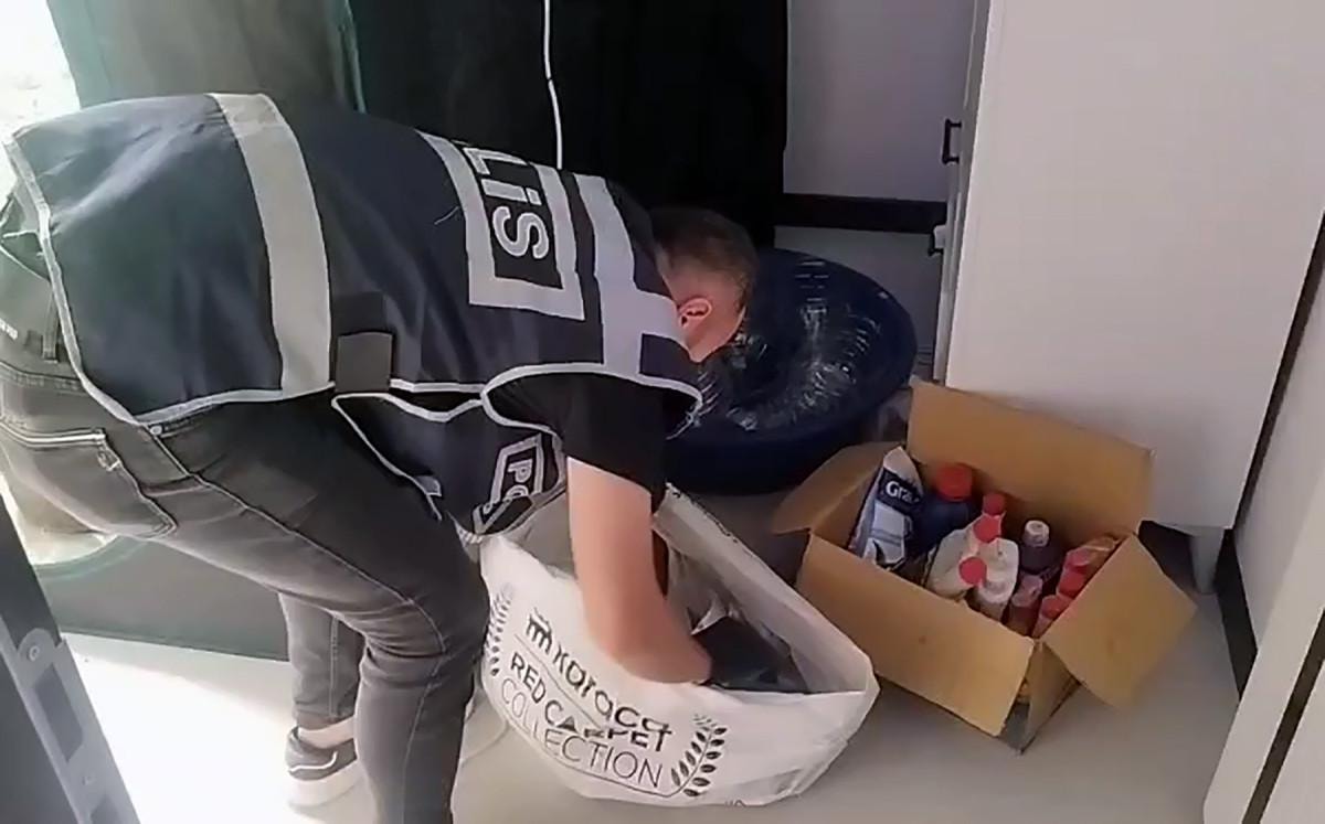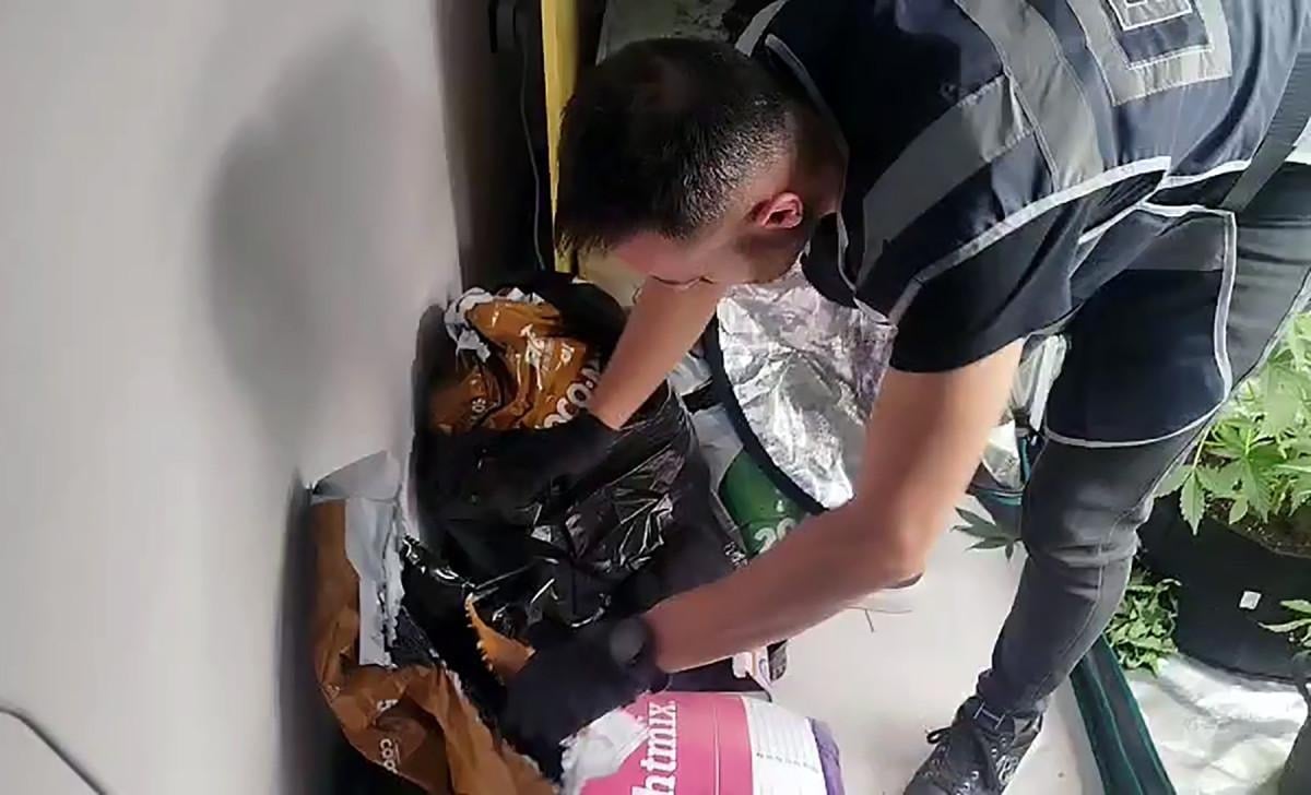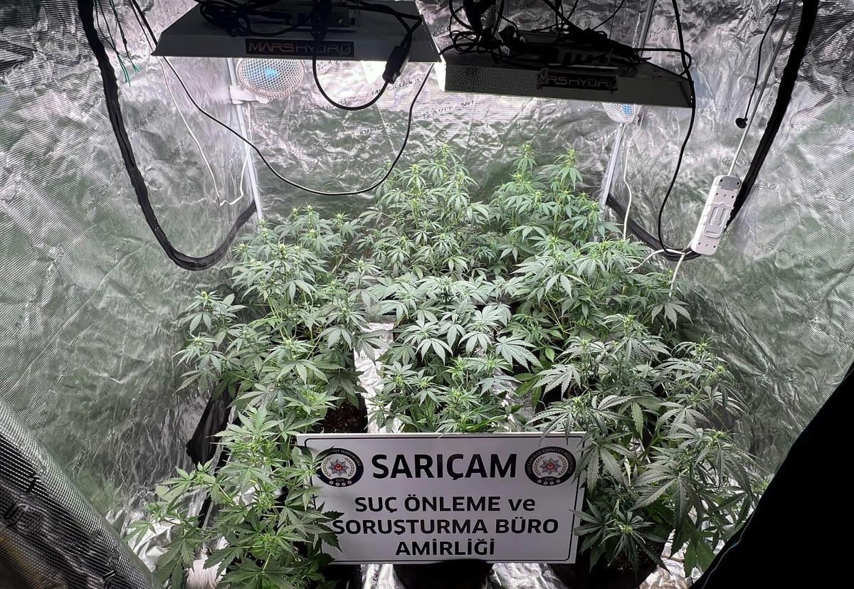 Arama yapan ekipler termal çadır içerisinde, özel düzenekle yetiştirildiği belirlenen 19 kök Hint keneviri, 121 gram kurutulmuş esrar ile uyuşturucu üretiminde kullanılan LED lamba, havalandırma aparatı, projektör, ısı ölçer ve toprak ele geçirdi.