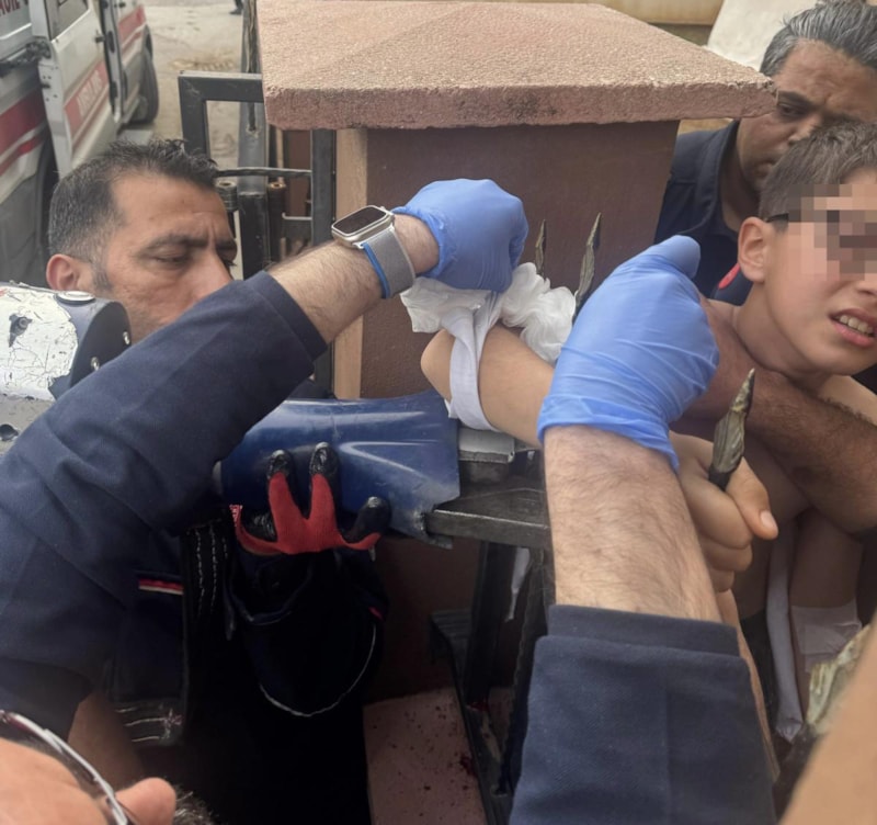 Duvarın üzerinde yürümek istediği sırada dengesini kaybetmesiyle demir parmaklığın sağ koluna girdiği çocuk, demir parmaklıkla hastaneye kaldırıldı.