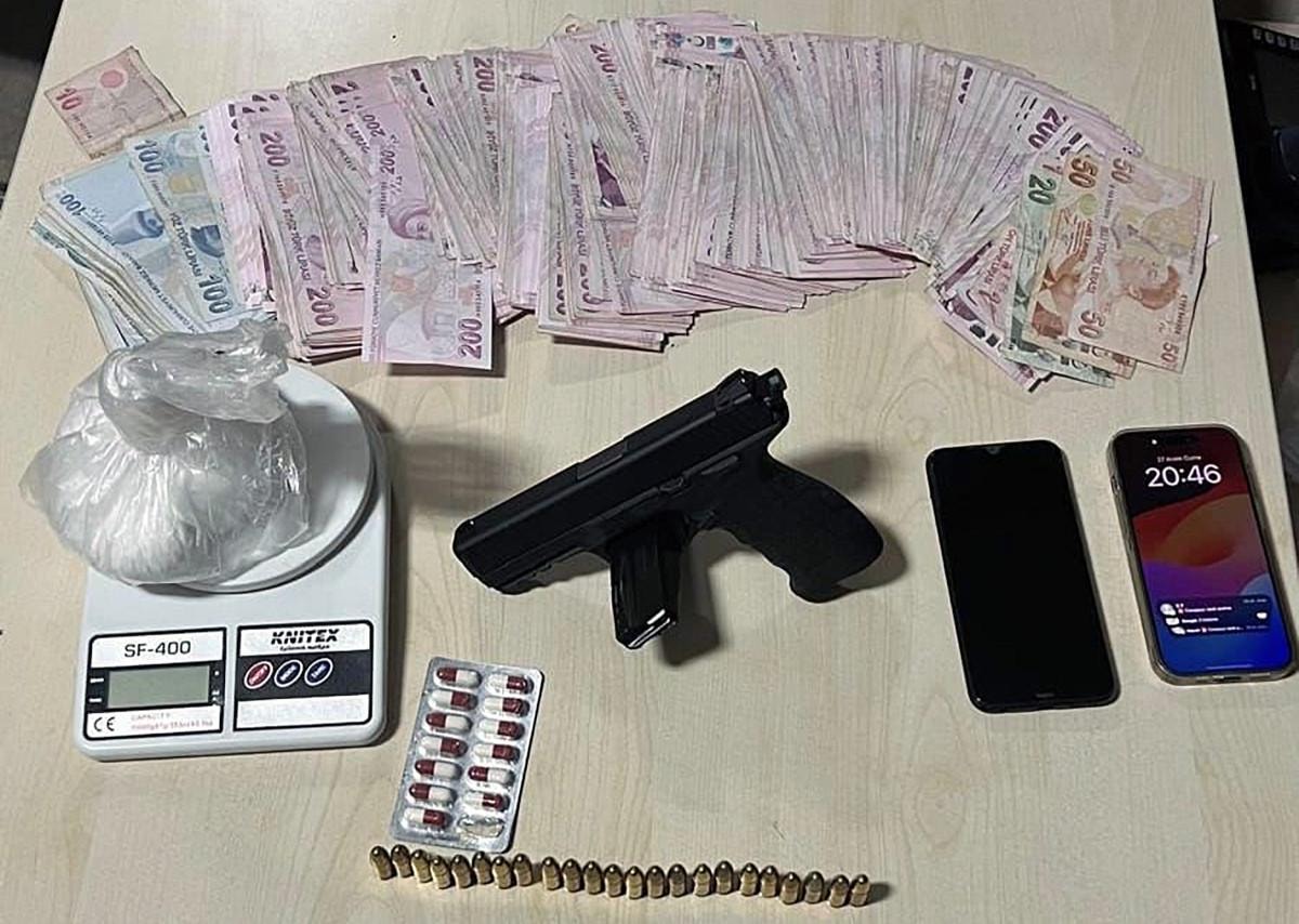 Yapılan aramada ruhsatsız tabanca ile 23 mermi, 13 uyuşturucu hap, hassas terazi ve uyuşturucu madde ticaretinden elde edildiği değerlendirilen 103 bin 290 lira ele geçirildi.