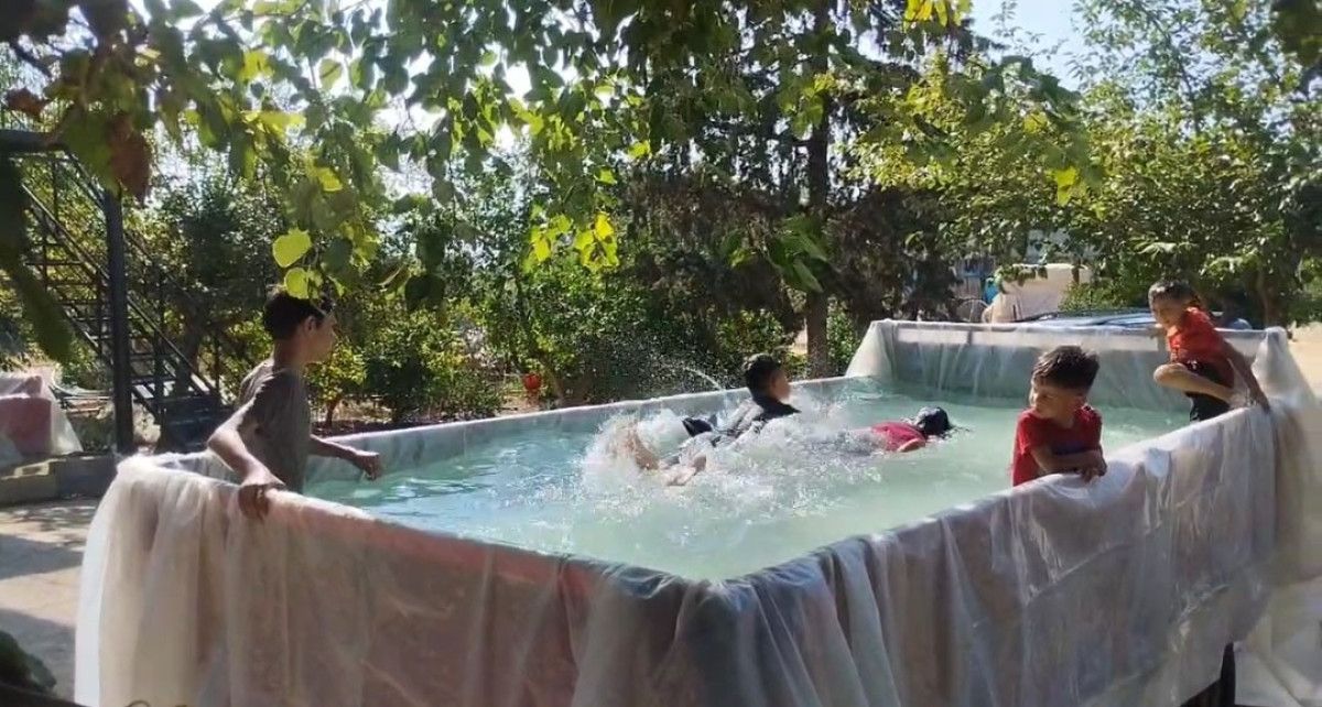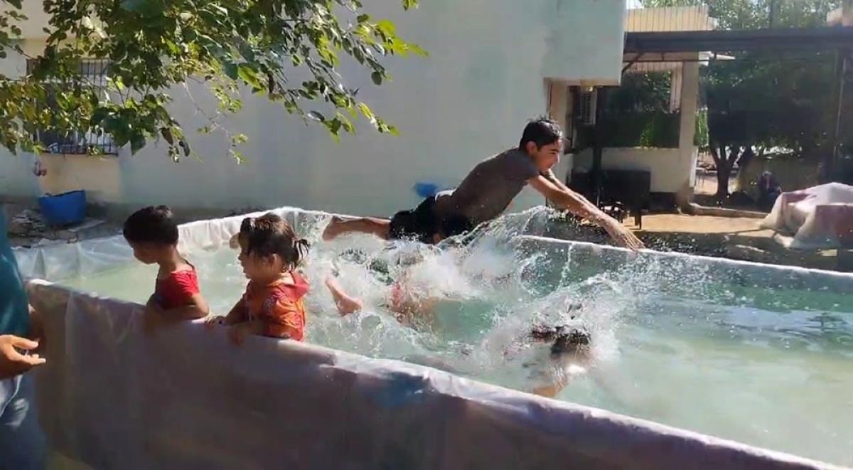 Yumurtalık ilçesine bağlı Zeynepli Mahallesinde yaşayan 3 çocuk babası Serdal Eroğlu da çocuklarını serinlenmek için traktörünün römorkunu havuza çevirdi.