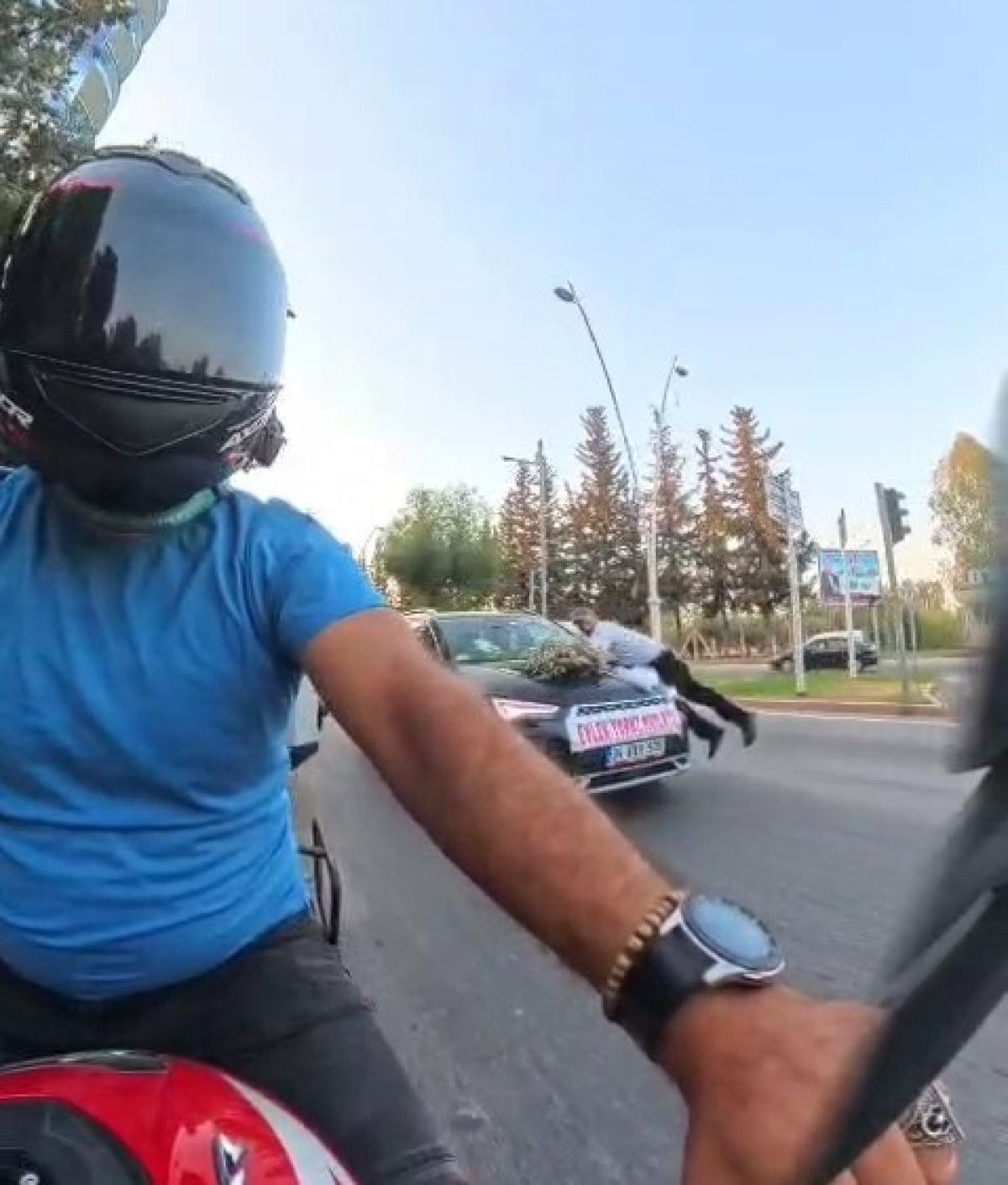 Kırmızı ışıkta duran gelin arabasının kaputuna atlayan şahıs, bir süre boyunca kaput üstünde yolculuk yaptı.