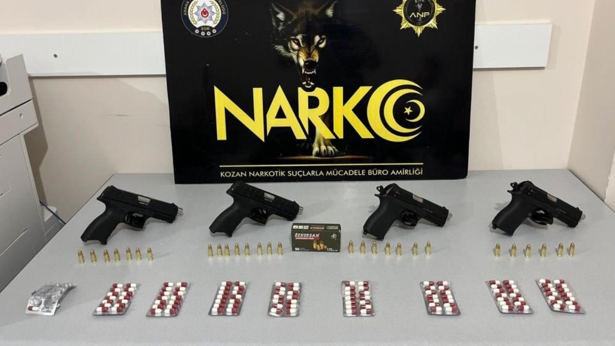 Araçta bulunan 4 kişi gözaltına alınırken, yapılan aramada 4 ruhsatsız tabanca, 113 sentetik ecza hapı ve 28 adet 9x19 mm çapında fişek ele geçirildi.