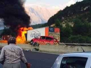 Adana-Ankara otoyolu Pozantı gişeleri yakınlarında freni boşalan TIR, önünde seyir halinde olan kamyon, otomobil ve kamyonetlere çarpıp alev aldı.