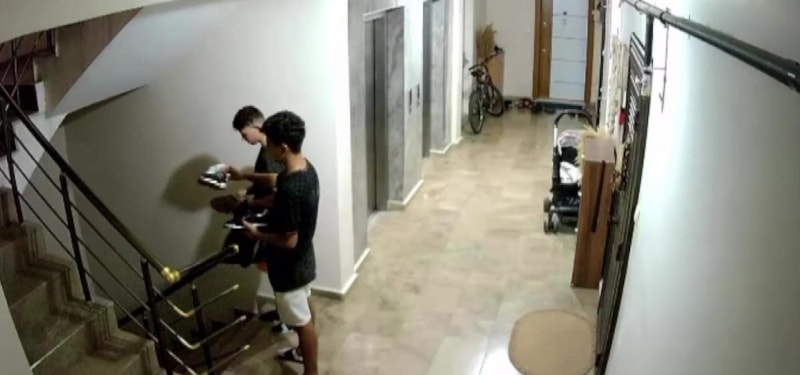 Adana’nın Yüreğir ilçesi Kiremithane Mahallesi’nde bir apartmanda, kimlikleri henüz tespit edilemeyen 2 genç, güvenlik kamerasına yansıyan ilginç bir olaya karıştı.