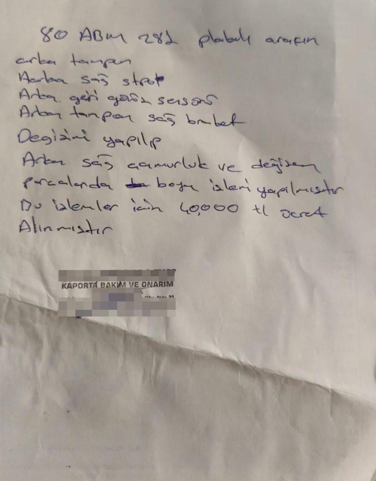 Otomobilinin sağ arka tarafı hasar gördüğü için aracına 40 bin TL'lik masraf yapılacağı ve hasar kaydı işlenmeyeceği söylenen Tiken, işlemlerin yapılmasını kabul etti.