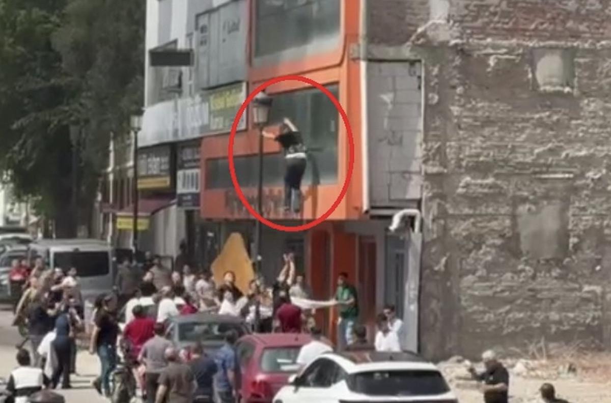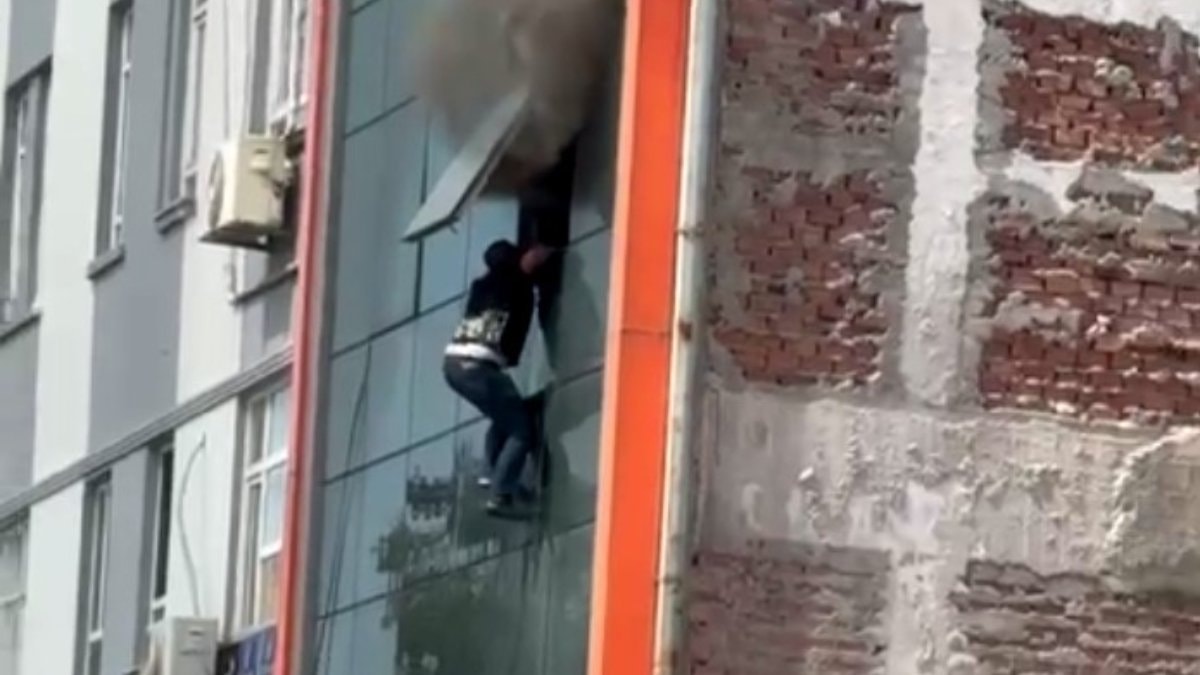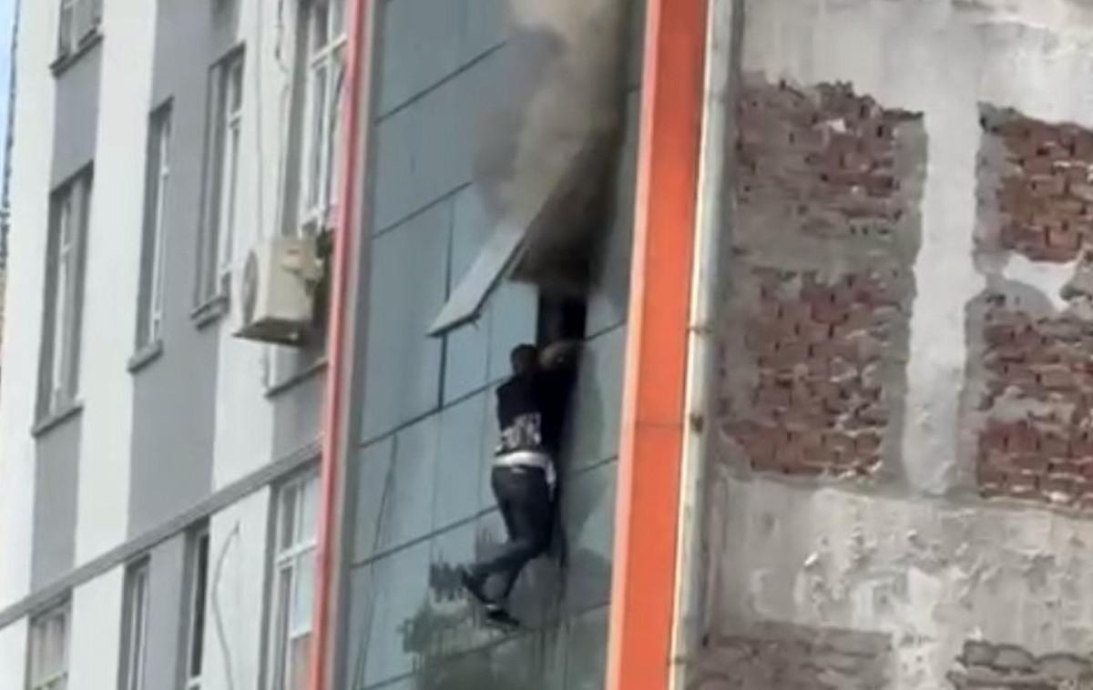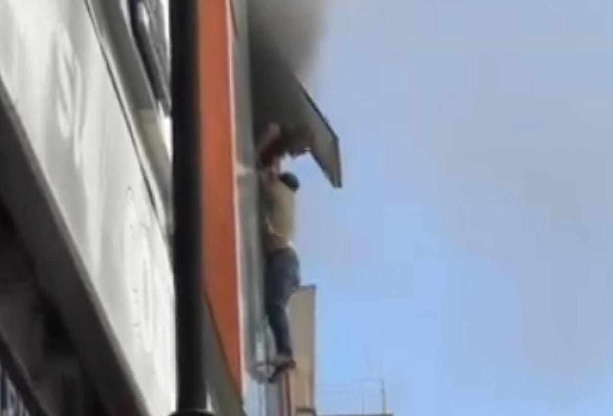 İşçilerden biri kurtulmak için pencereden sarktı, diğeri de onun ellerinden tuttu.