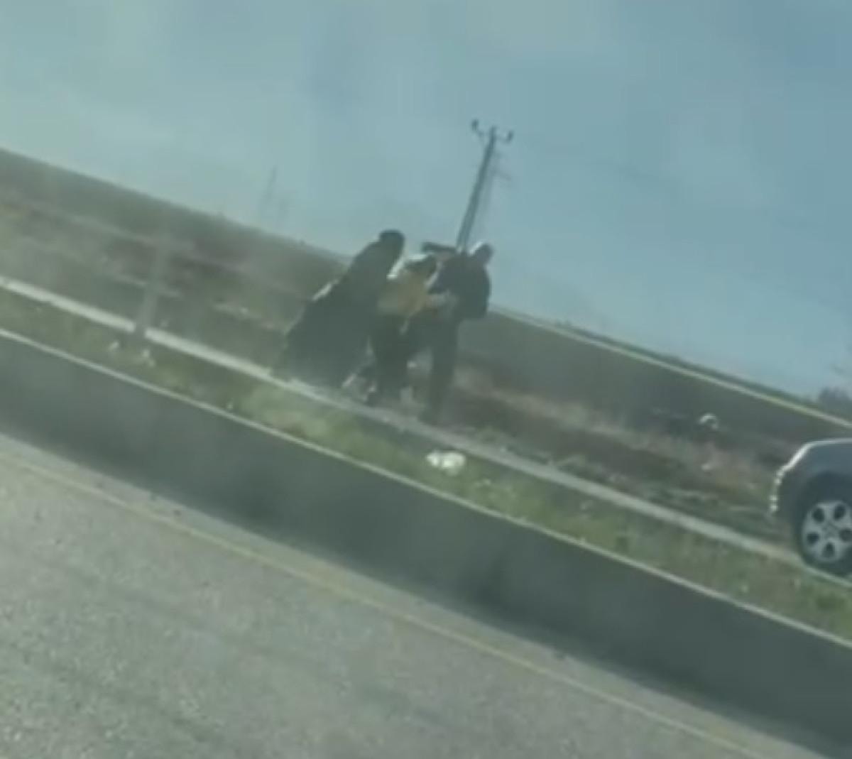 Bu sırada araçtaki kız çocuğu da inerek, çifte engel olmaya çalıştı. Adam, çocuğa tokat attı. Genç kadını araca bindiren çift, daha sonra yolculuğa devam etti.