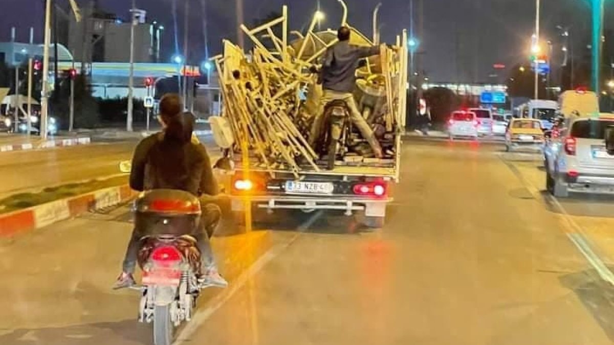 Merkez Seyhan ilçesinde çekilen görüntüde kamyonetin hurda yüklü kasasında duran plakasız motosikletli şahıs, adeta kazaya davetiye çıkardı.