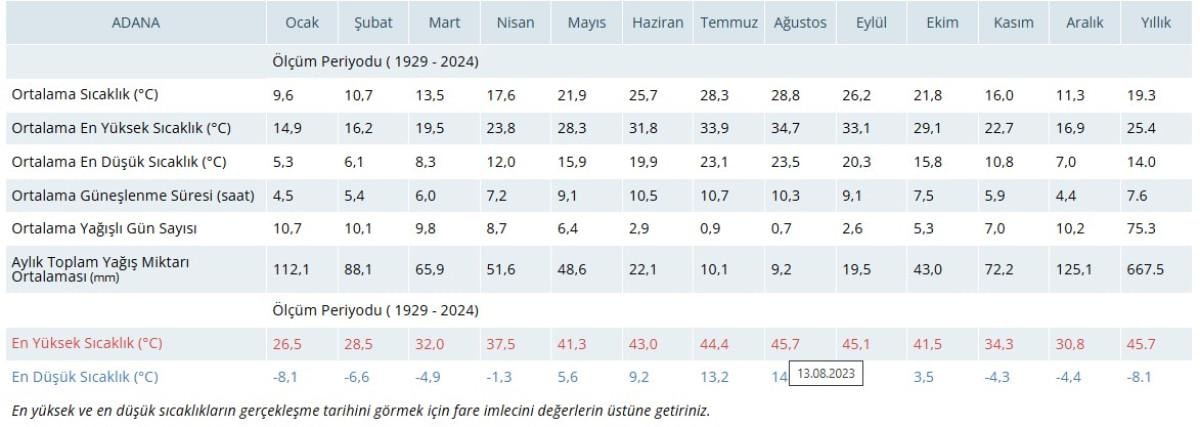 Bugün an itibariyle Adana'da hava sıcaklığının 46,7 derece olurken, 13 Ağustos 2023'te sıcaklık 45,7 derece olarak ölçülmüştü.