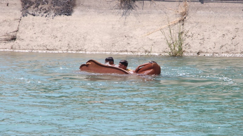Kavurucu sıcakların etkisini sürdürdüğü Adana'da her yaz onlarca kişinin ölümüne neden olan kanallara giren bazı çocuklar, akıntıya kapılmamak için eski bir koltuğu kayık gibi kullanarak tehlikeli sulara atladı.