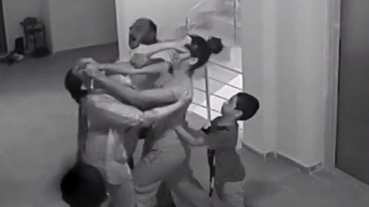 Apartmandaki güvenlik kameralarına yansıyan kavga, diğer dairelerde oturanların araya girmesiyle son buldu.