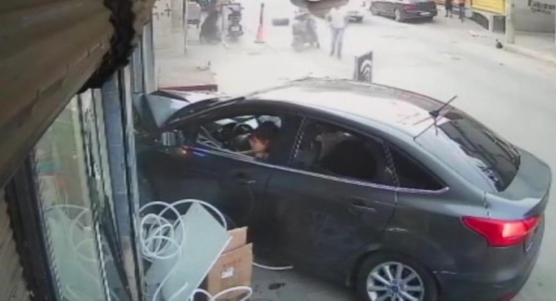 Adana'da kontrolden çıkan bir otomobilin markete girmesi güvenlik kamerası tarafından kaydedildi.