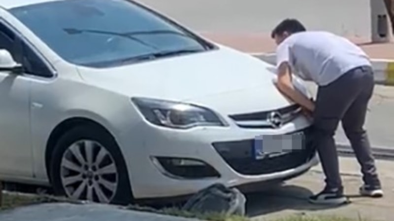 Şahıs bir otomobilin kaputuna yaslanıp değişik hareketler yaptı.