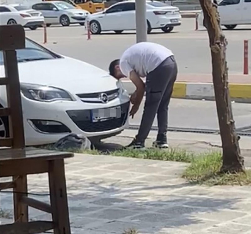 Adana'da uyuşturucu bağımlısı olduğu öne sürülen bir kişinin, kendinden geçtiği ve otomobilin kaputuna yaslanıp değişik hareketler sergilediği anlar kameralara yansıdı.