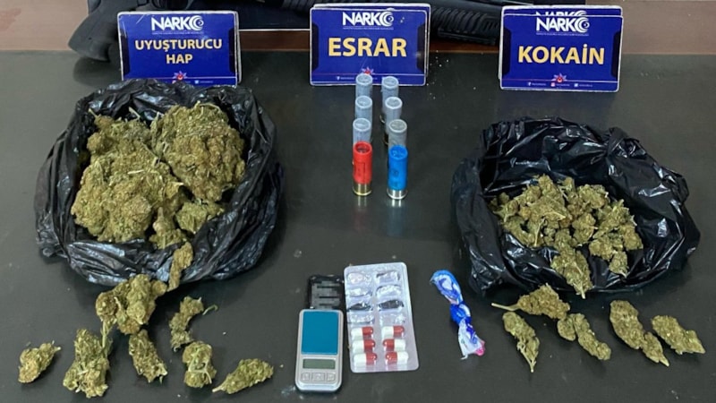 Aramalarda 3 pakette toplam 363,74 gram skunk esrar, 6 adet uyuşturucu hap, 0.67 gram kokain, hassas terazi ve ruhsatsız pompalı tüfek ele geçirdi.