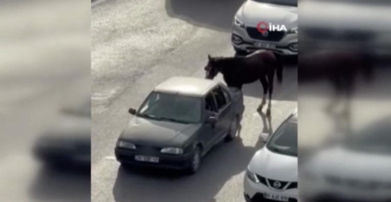 Sürücü ve at sahibi hayvana acımadan trafikte bir süre böyle ilerledi.