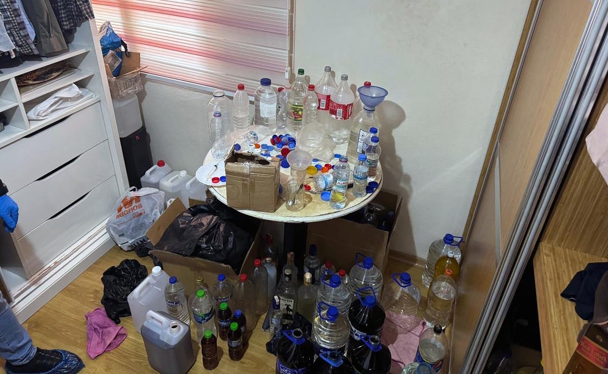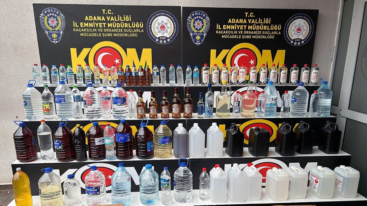 8 kişinin gözaltına alındığı operasyonda yapılan aramalarda bir kısmı sahte 399 litre kaçak içki, içki yapımında kullanılan 86 litre etil alkol ile 766 aroma verici kit ele geçirildi.