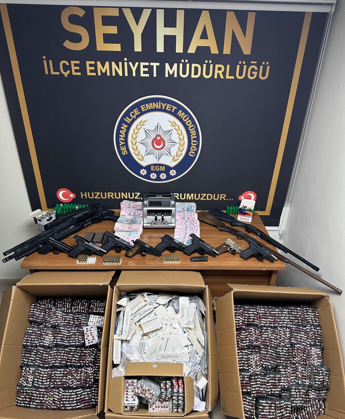 Ekipler, Serkan Ü.'nün iş yerindeki aramada 1'i kurusıkı 8 ruhsatsız tabanca, 4 ruhsatsız av tüfeği ile 300 mermi, 54 bin 265 uyuşturucu hap, suçtan elde edildiği değerlendirilen 499 bin 150 lira ile para sayma makinesi ele geçirdi.