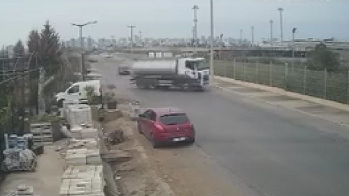 Güvenlik kamerasınca kaydedilen görüntülerde tankerin otoparka devrilme anı yer aldı.