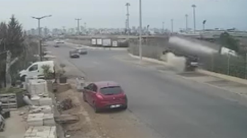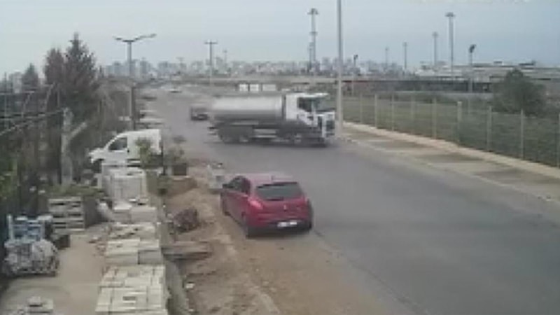 Adana'da şoförünün alkollü olduğu öne sürülen su tankerinin alışveriş merkezinin otoparkına devrilmesi güvenlik kamerasına yansıdı.
