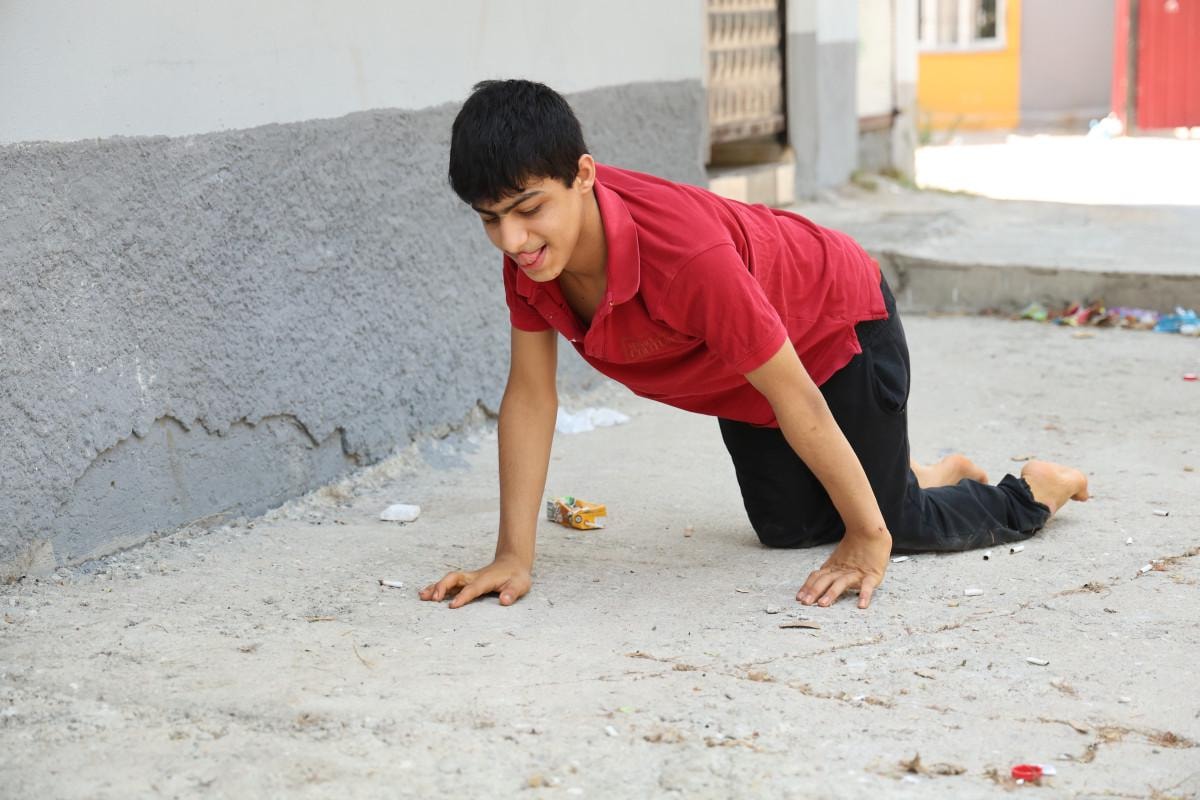 Tek sosyal aktivitesi tekerlekli sandalyesiyle gezmek olan Enes, şimdi sokaklarda emekleyerek vaktini geçirmeye başladı.