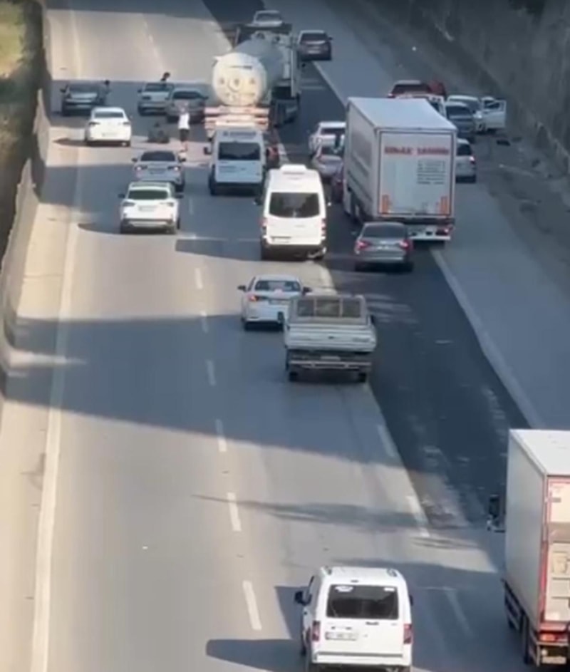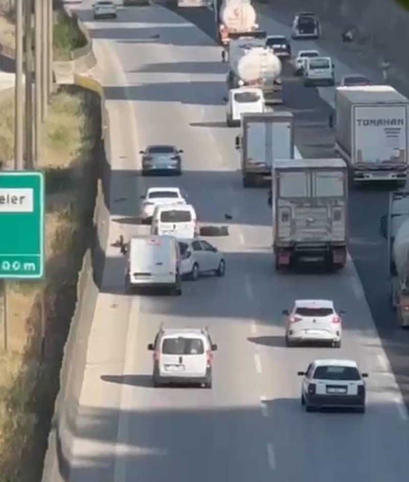 Lastiğe çarpmamak için manevra yapan otomobil, yola paralel ilerleyerek araçların arasından geçip güvenlik şeridine savruldu.