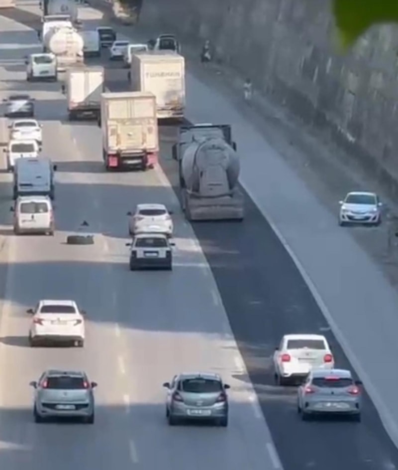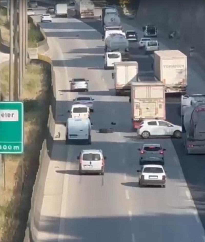 Adana'da Tarsus-Adana-Gaziantep Otoyolu'nun Hastaneler mevkiinde hareket halindeki tırın tekerinden kopan lastik kaplaması sol şeride düştü.