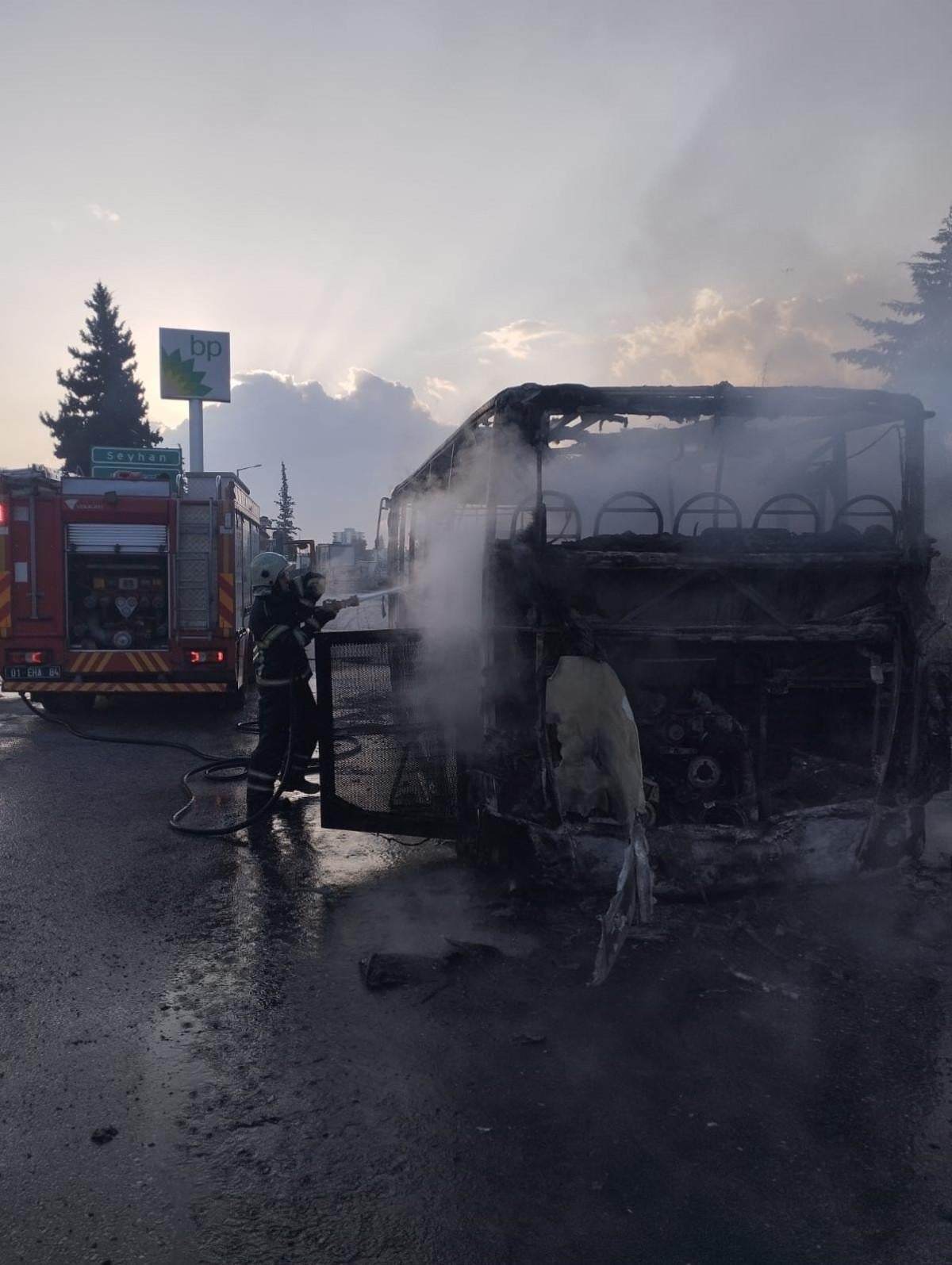 Yangın sonucu toplu taşıma aracından geriye demir yığını kaldı. Polis yangınla ilgili inceleme başlattı.