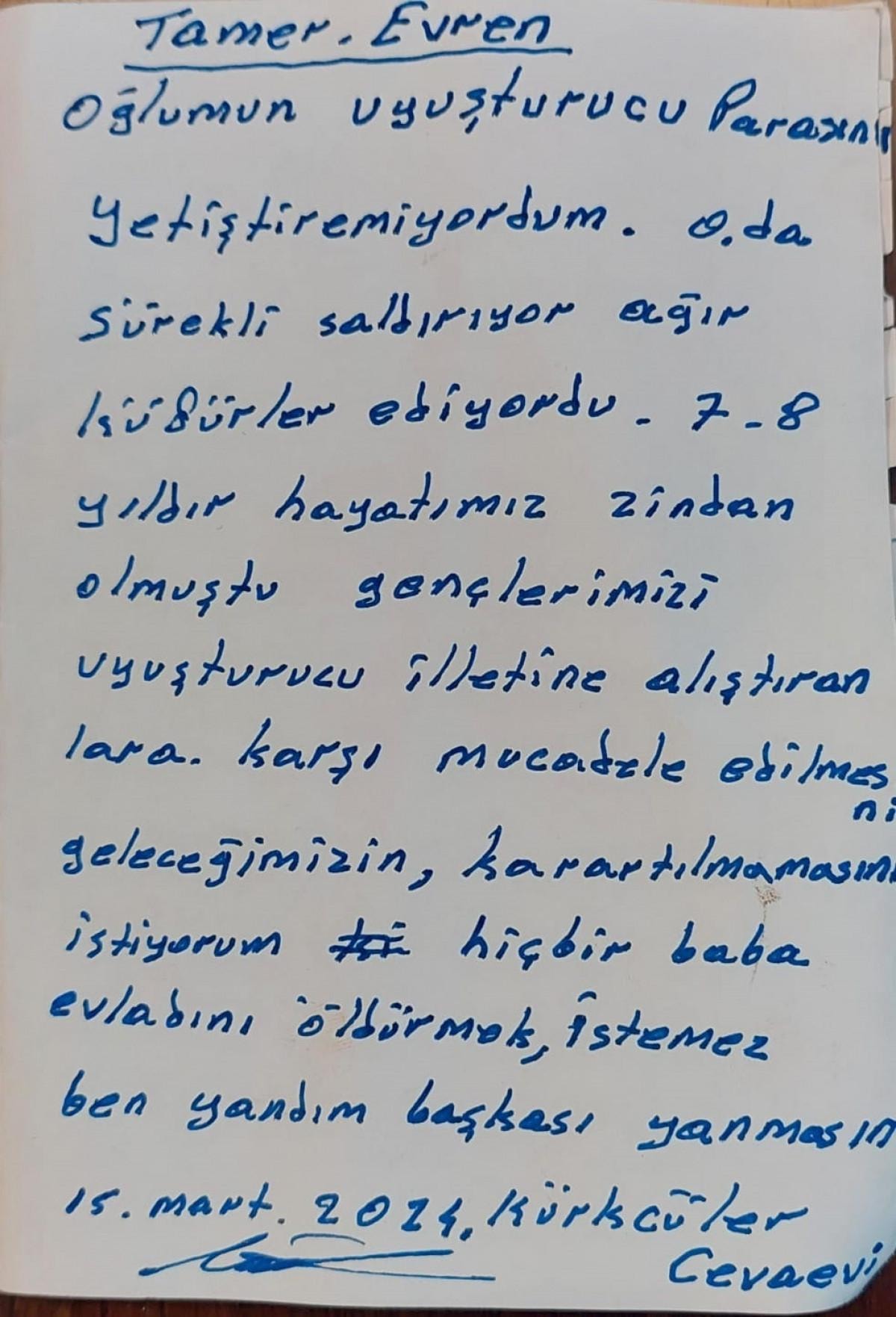 Adana'da, 38 yaşındaki uyuşturucu bağımlısı oğlu Hazım Evren'i, "uyuşturucu parası" tartışması sırasında av tüfeğiyle vurarak öldüren 66 yaşındaki baba Tamer Evren, cezaevinden avukatıyla mesaj gönderdi.