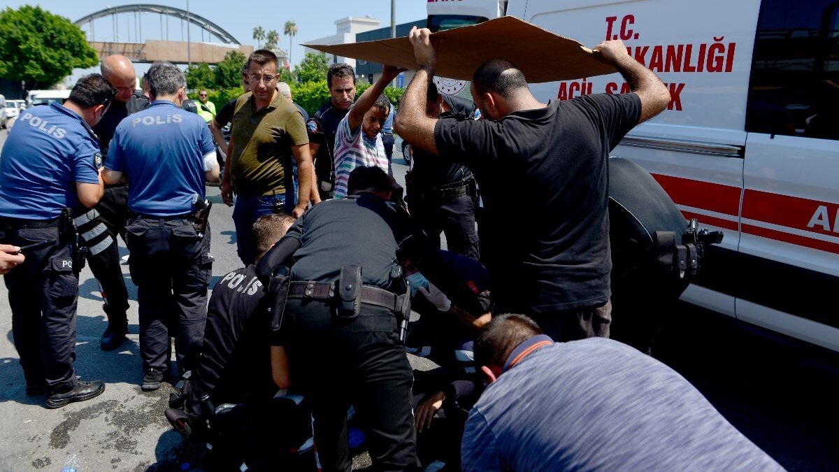 Sağlık görevlileri yaralı polis memuruna ilk müdahaleyi yaparken, çevredeki vatandaşlar polisleri güneşten korumak için kartonlarla gölgelik alan oluşturdu.