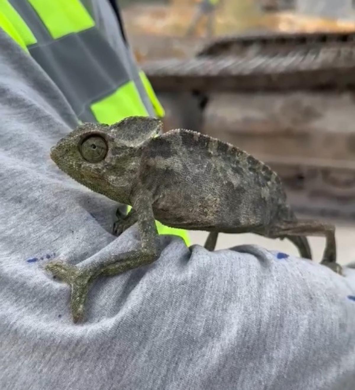 İş makinelerini durduran ekipler, bulunan canlının bukalemun olduğunu anladı.